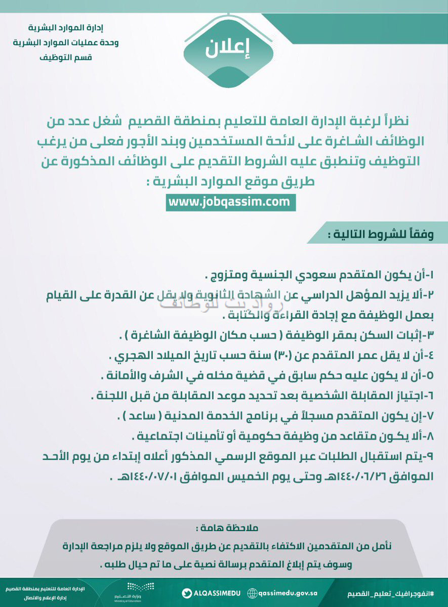 تعليم القصيم وظائف على بند الاجور والمستخدمين في محافظات القصيم