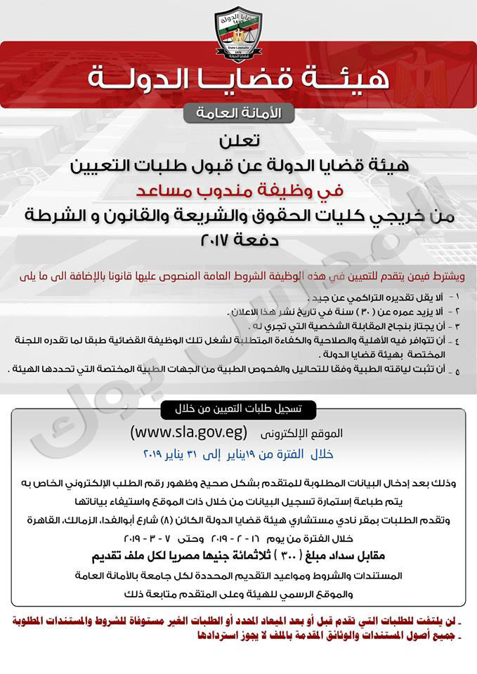 رابط التقديم في وظائف هيئة قضايا الدولة 2019 لخريجي كليات الحقوق والشريعة والقانون والشرطة 2017 Www Sla Gov