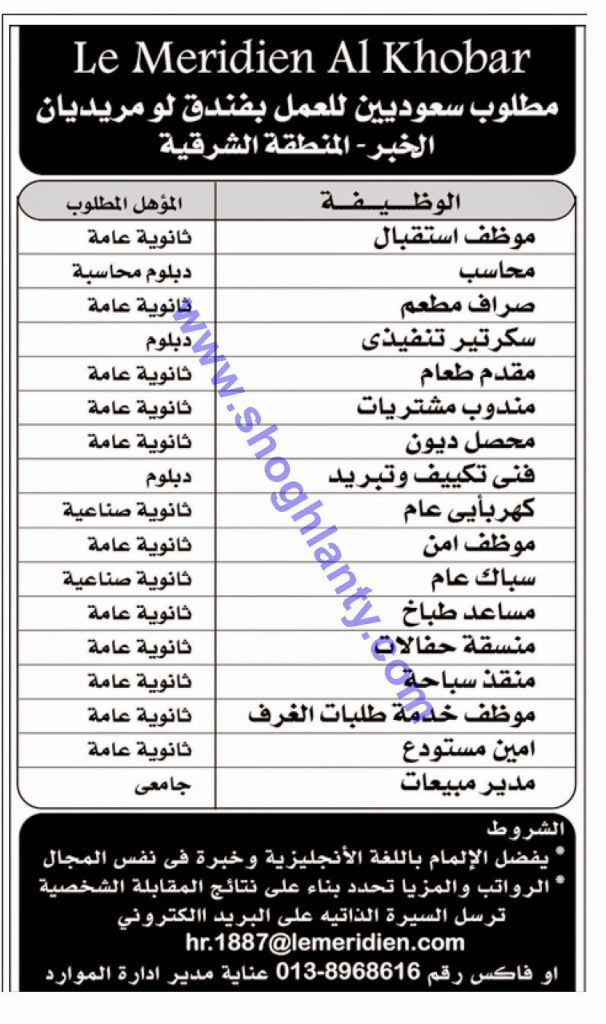 وظائف فندق لو مريديان الخبر الشرقية استقبال ومحاسب وإداريين وفنيين ومحصل وإخرى