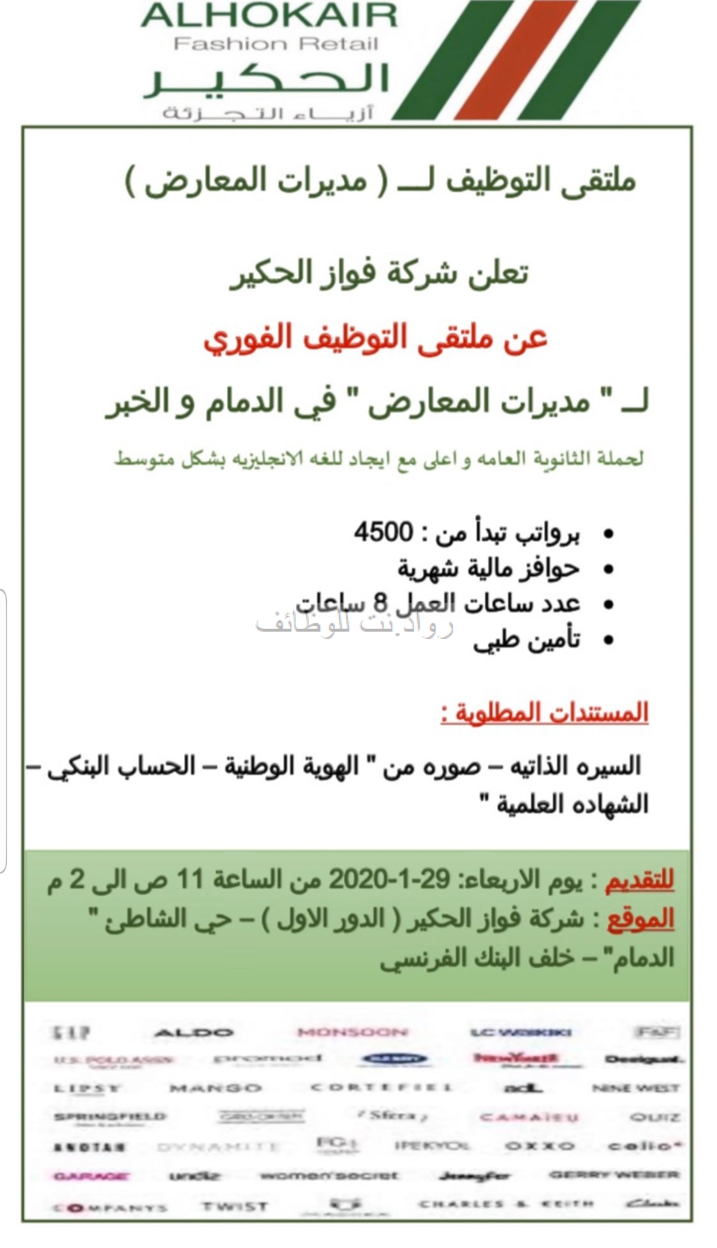 شركة فواز الحكير لأزياء التجزئة وظائف نسائية مديرات معارض في الدمام والخبر
