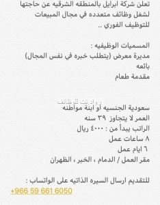شركة ابرايل وظائف نسائية في الشرقية مديرة معرض بائعة مقدمة طعام