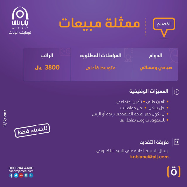 وظائف نسائيه في المدينة المنورة تسويق عن بعد الراتب نسبة من المبيعات التقديم يوم الثلاثاء